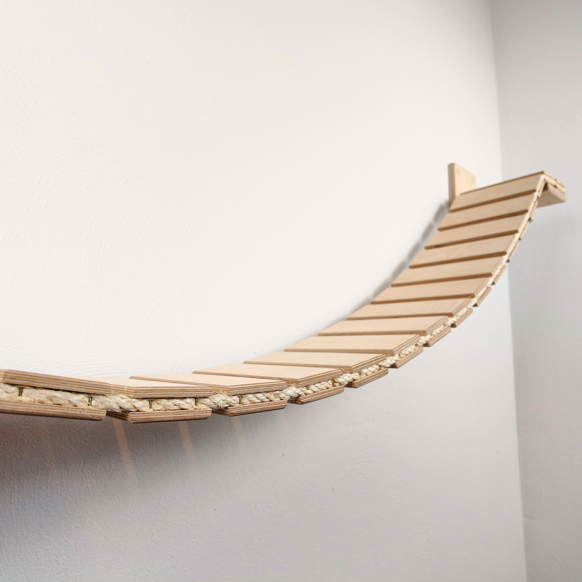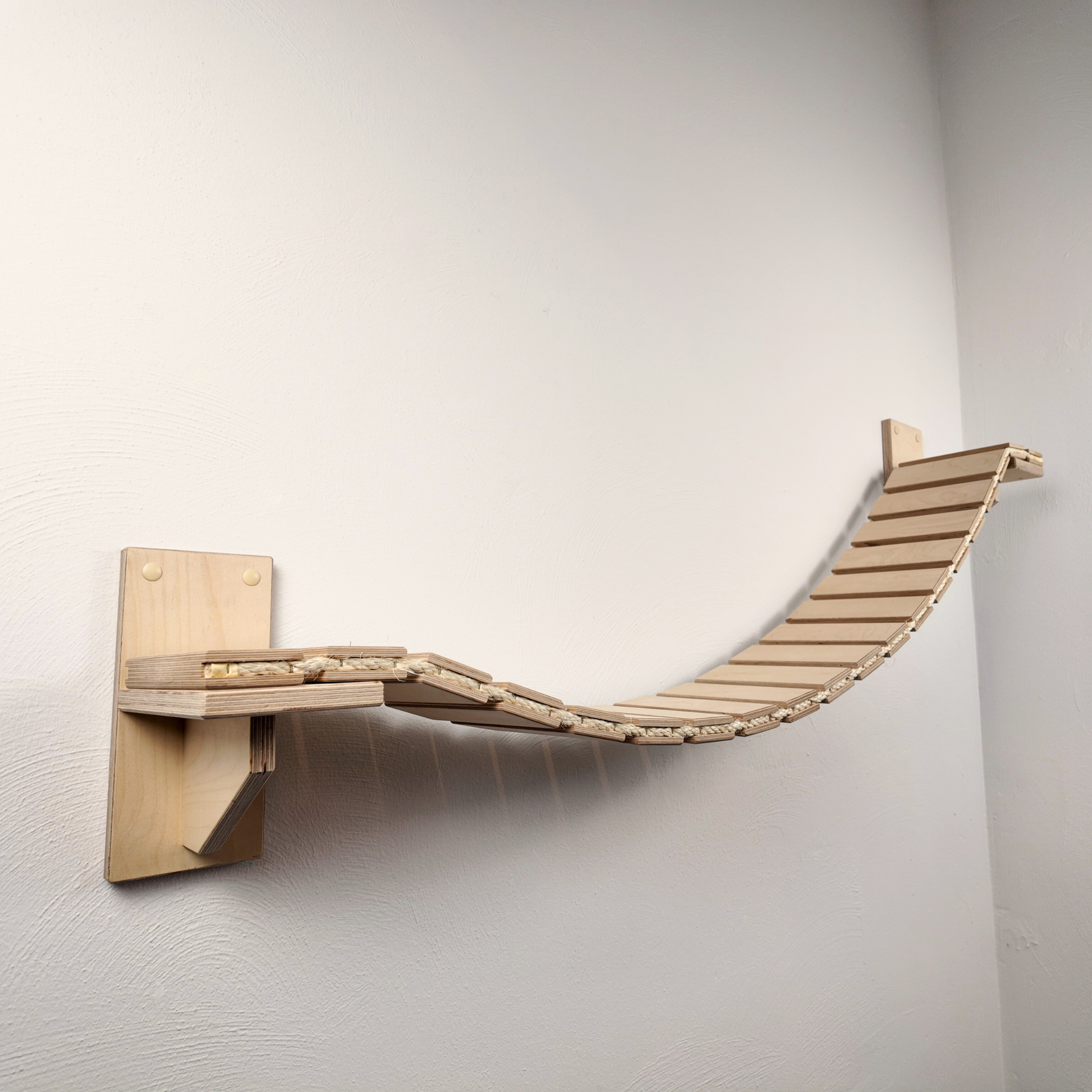 Empfehlung: Je nach Gewicht Ihrer Katze sollten Sie aus statischen Gründen die Hängebrücke nach ca. 1500 mm zwischen 2 Brückenhaltern einplanen.