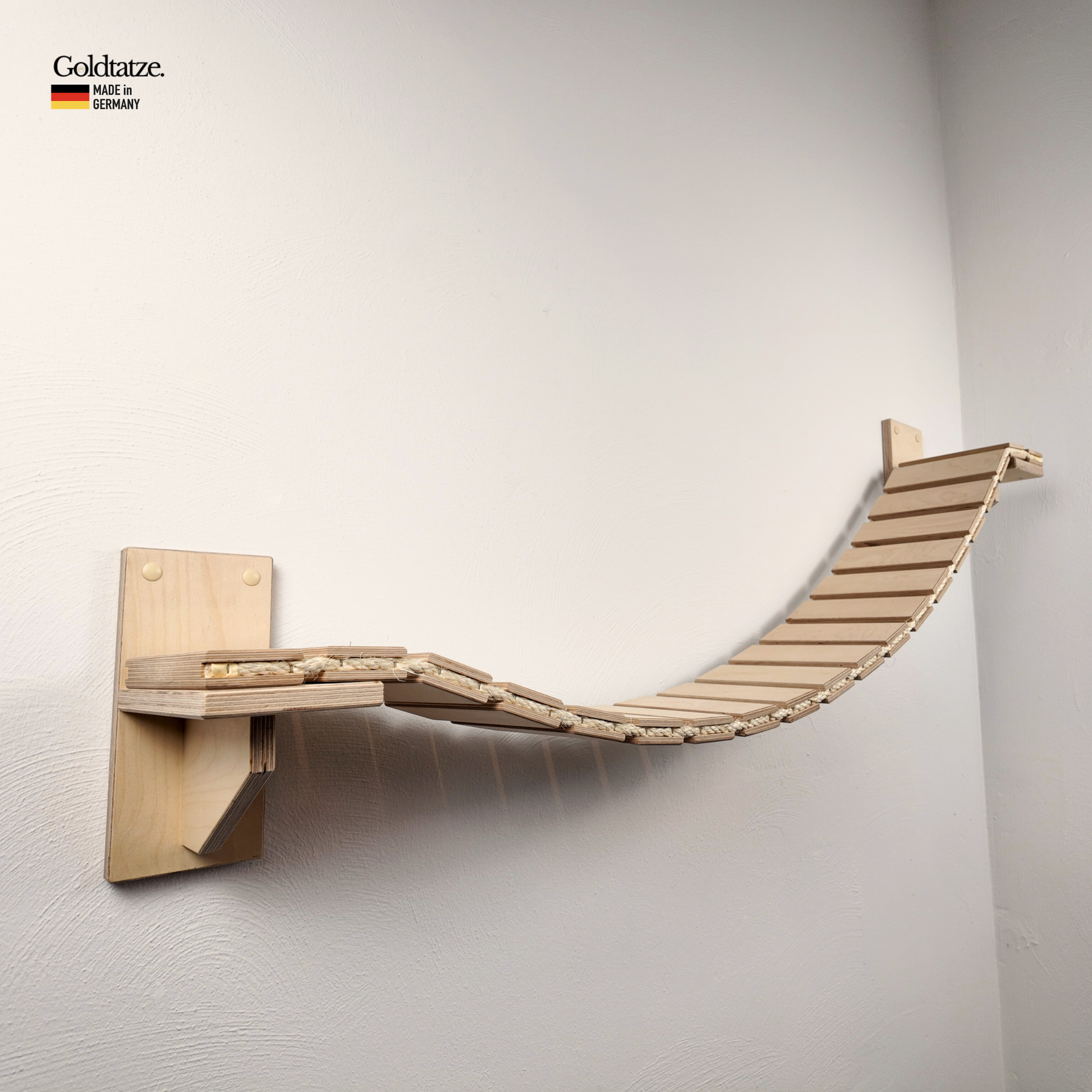 Wie alle Goldtatze-Produkte wird auch die Hängebrücke in Deutschland handgefertigt und auf höchste Stabilität geprüft. Das robuste Design sorgt für Sicherheit und Langlebigkeit – selbst bei intensiver Nutzung.